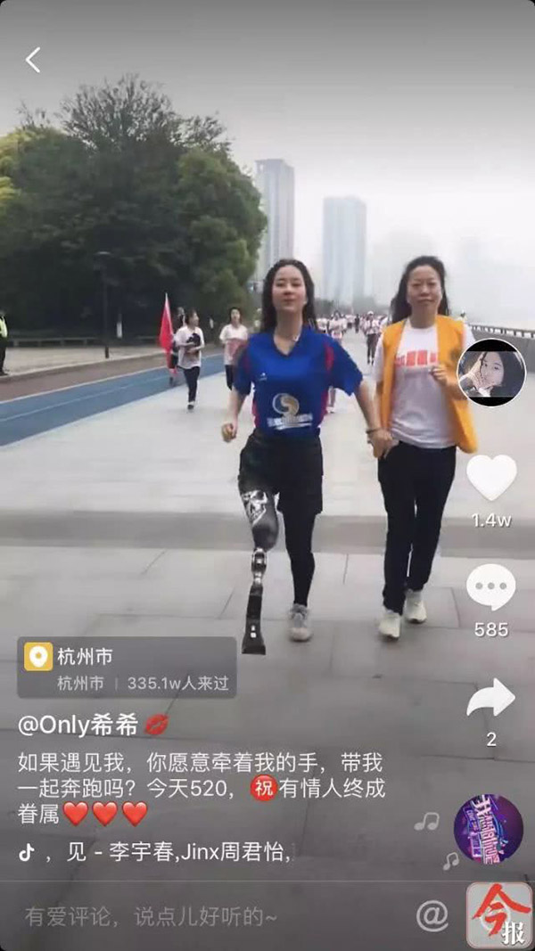 “谁说戴假肢不能跳舞,让我也火一把。”董栩希跳着时兴的舞蹈,搞笑的表情让观者忍俊不禁。她分享了戴着假肢在运动场和跑步机上跑步的快乐,分享了和朋友备战无障碍马拉松比赛的激动:“人活着不是用眼泪博得同情,而是用汗水赢得掌声。”