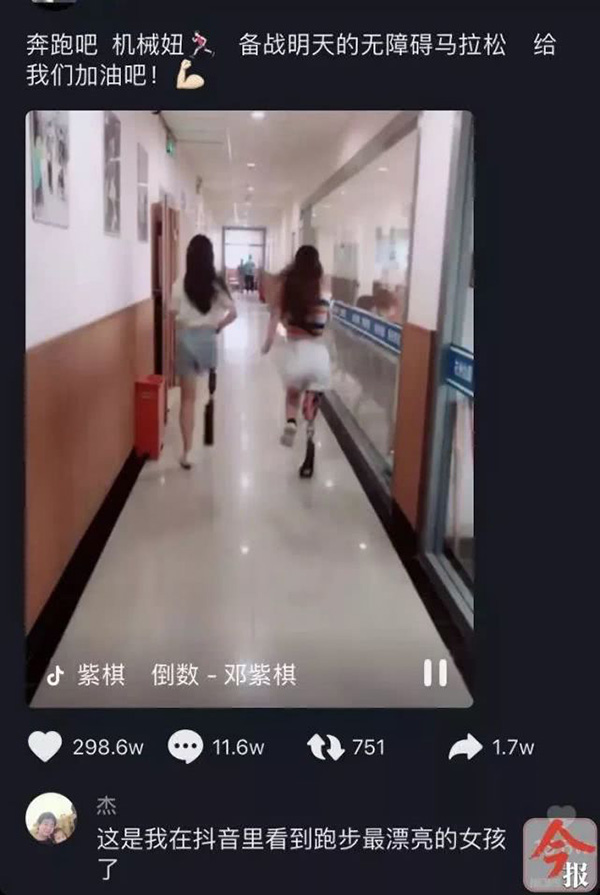 董栩希通过自己的视频传递正能量,网友则通过留言给予她鼓励。一个网友看完她戴假肢跑步的视频,评价道:“这是我在抖音里看到跑步漂亮的女孩子。”更有网友表示:“看了你,才发现世界上还有很多美好的风景。”